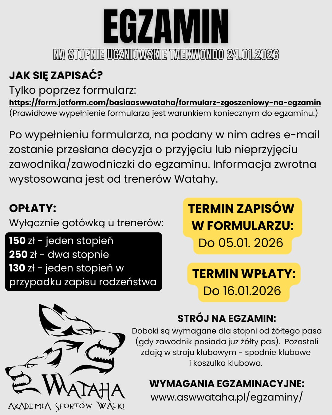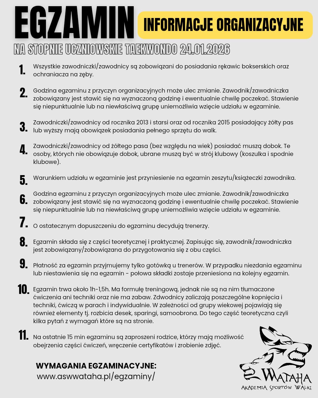 Już 24 stycznia kolejny egzamin na stopnie uczniowskie w taekwondo. Tradycyjnie, egzamin dla wszystkich naszych zawodników, odbywać będzie się w Częstochowie (OSP Kiedrzyn, ul. Ludowa 95.)