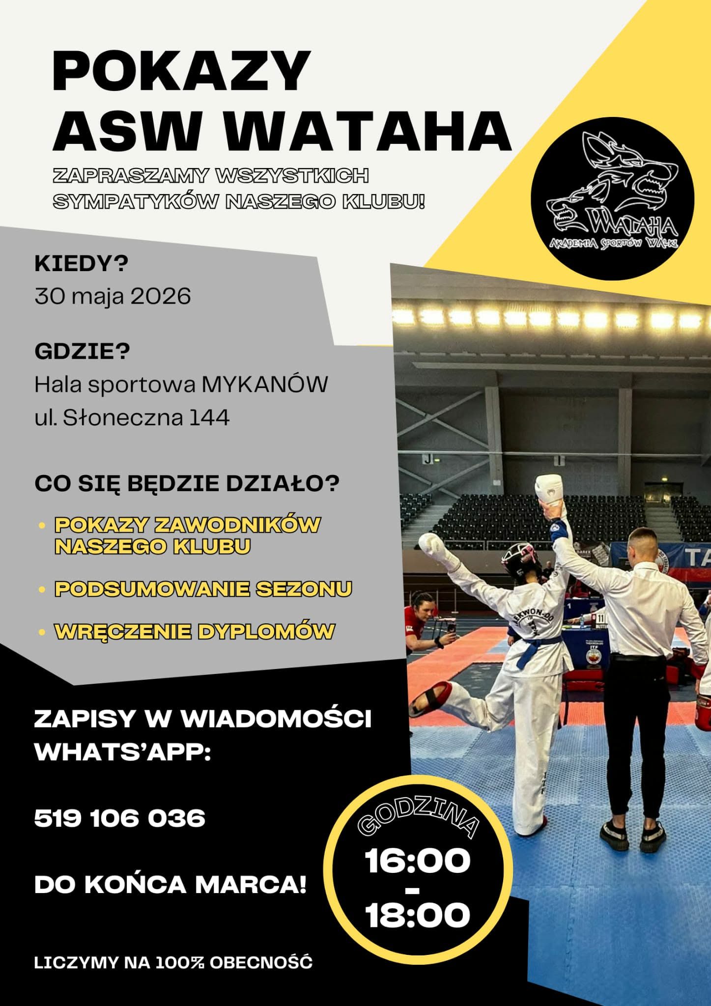 On 31 marca 2026 by magdalenaplanujemy od tego roku wprowadzić ważne i wyjątkowe wydarzenie do naszego klubowego kalendarza – POKAZ WSZYSTKICH ZAWODNIKÓW ASW WATAHA. Zaplanowaliśmy go na 30.maja 2026 g. 16.00 do 18.00 na Hali Sportowej w Mykanowie.